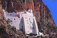 |  |  ΜΟΝΑΣΤΗΡΙ ΤΗΣ ΠΑΝΑΓΙΑΣ ΤΗΣ ΧΟΖΟΒΙΩΤΙΣΣΑΣ Αριστούργημα της αρχιτεκτονικής του νησιού είναι το βυζαντινό μοναστήρι της Παναγιάς Χοζοβιώτισσας. Βρίσκεται ακροβολισμένο σε μια ορθοπλαγιά, 300 μέτρα πάνω από το Αιγαίο και κτίστηκε το 1088 από τον αυτοκράτορα Αλέξιο Κομνηνό το Β'. Οφείλει την ονομασία του στο μικρασιατικό χωριό Χόζοβο. Σύμφωνα με την παράδοση, την εποχή των εικονομάχων μια γυναίκα έβαλε την εικόνα της Παναγίας σε μια βάρκα που έφτασε ακριβώς σε αυτό το μέρος και μάλιστα υπό τη λάμψη θεϊκού φωτός κάτι που προκάλεσε δέος στους κατοίκους. 350 σκαλοπάτια διαβαθμίζουν το καλντερίμι που ξεκινά από την κορυφή της Χώρας και φτάνει μέχρι το Μοναστήρι. Η κάτασπρη, απέριττη όψη του κτιρίου εναρμονίζεται θαυμάσια με τα πολύχρωμα ανώμαλα βράχια. Εκτός από την εικόνα της Παναγίας φυλάσσονται στο μουσείο του μοναστηριού εκκλησιαστικά κειμήλια και χειρόγραφα. Ακολουθώντας ένα παλιό έθιμο, την εβδομάδα μετά το Πάσχα, γίνεται περιφορά της εικόνας της Παναγίας σε όλο σχεδόν το νησί.